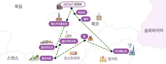 ☆★ 동유럽 3개국을 조금 더 깊이 품격있고 여유롭게 관광할 수 있는 일정[ 항공 ]- 프리미엄 국적기 아시아나항공 인천-프라하 직항편 비즈니스석 왕복 탑승 - 실시간 비즈니스석 및 특가항공권(U CLS)으로 진행되며, 해당 좌석 불가시 차액 발생 및 선발권 진행 될 수 있습니다. [ 호텔 ]- 엄선한 4성급 호텔 5박 (★★★★)~ 5성급 호텔(★★★★★) 3박 숙박- 5성급호텔(★★★★★) 2박 & 비엔나 4성급(★★★★)호텔 2박 연박 으로 편안한 휴식[ 특별한 일정 ] 다채로운 동유럽 정석 여행 기회 및 핵심 관광지 입장 ■ 체코- 구시가지 전체가 유네스코 세계유산으로 지정된 아름다운 텔츠 - 동유럽의 파리라 불리우는 아름다운 중세 도시‘ 프라하 ♡ 야경(일몰), 트램탑승- 프란츠 카프카의 작업실을 볼 수 있는 예술의 거리 황금소로 입장 - 블타바 강이 마을을 휘감아 흐르고 있는 동화 속 아름다운 마을 체스키크롬로프 ■ 오스트리아- 유네스코 세계문화유산으로 등록되어있는 할슈타트마을 - 알프스 산맥의 경치를 자랑하며, 오스트리아 마을과 문화가 보존되어있는 잘츠카머구트- 클림트의 대표작을 만날 수 있는 벨베데레 궁전 (상궁) 내부관람 - 오스트리아 합스부르크 왕가의 여름별장으로 사용된 쇤부른궁전 내부관람 - 사운드 오브 뮤직의 촬영지, 모차르트가 태어난 잘츠부르크 구시가지- 음악의 나라 오스트리아에서 비엔나 음악회 공연 감상■ 헝가리- 헝가리의 수도이자 다뉴브강을 따라 위치해 있는 부다페스트[ 식사 ]- 동유럽의 대표 전통식 제공- 오스트리아의 대표 음식 : 호이리게 정식, 슈니첼, 쯔비벨로스트브라텐- 체코의 대표 음식 : 스비치코바, 꼴레뇨, 보헤미안 립스 & 맥주 1잔- 헝가리 대표 음식 : 굴라쉬- 일정 중 호텔식/한식/중국식/현지식 등 제공[ 기타 ]- 전 일정 45~50인승 차량 탑승- 12명 이상 출발 시 한진관광 전문투어리더 동행-KW42721 일반석 상품과 연계 진행- 지역별 가이드의 설명을 자세히 들을 수 있도록 수신기 대여
